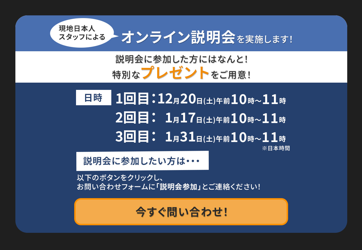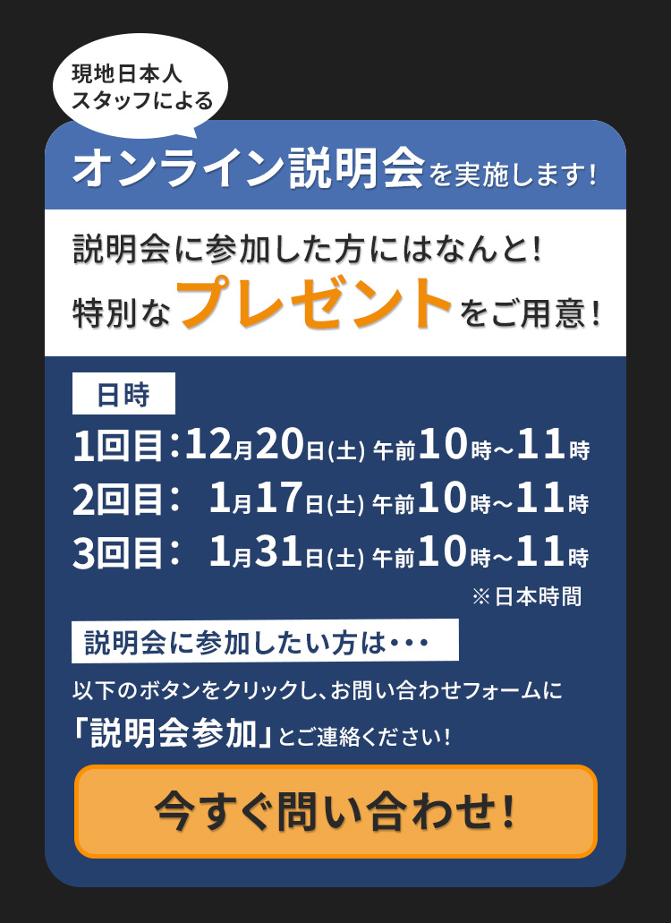 - ※トビタテ!留学JAPANの応募対象としてご活用いただけます。詳細は問い合わせにてご相談ください。